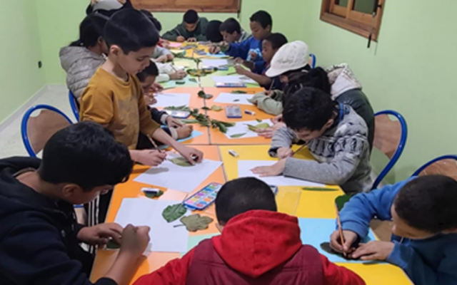 아이들이 집중해서 낙엽을 그리고 칠하고